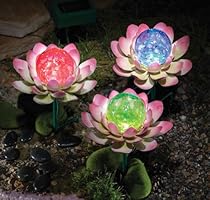 Color Changing Flowers: Stake this set of three solar-powered flowers into the ground then each evening the clear glass balls in their centers glow with an ever changing display of red blue & green light. Make an impressive and colorful addition to your home s nighttime landscaping. Each connected to each other by wire and stakes easily into the ground. Incl. 1 rechargeable AA battery. On/off button. Each 5 3/4"W x 6 1/2"H....[]